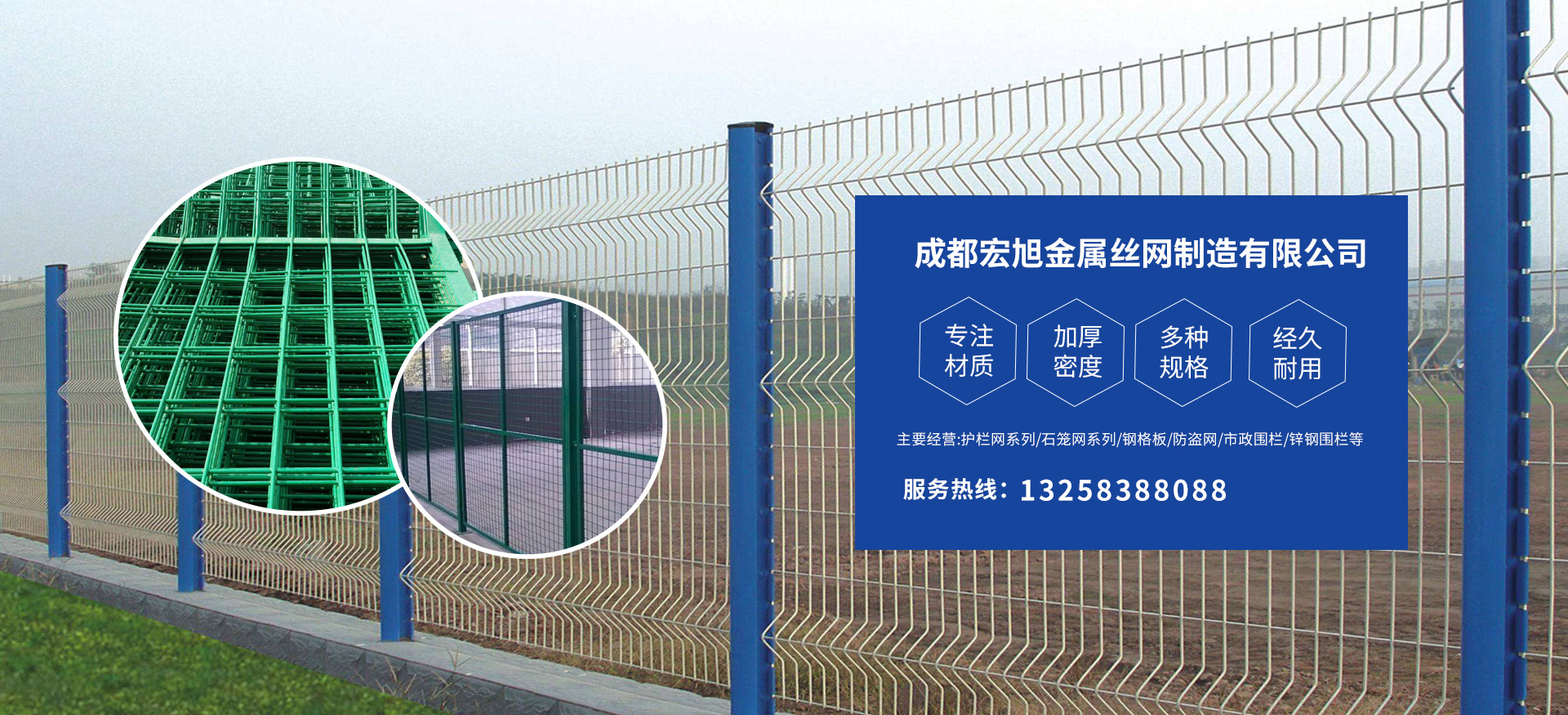 成都宏旭金屬絲網制造有限公司主營護欄網系列、石籠網系列、鋼格板、防盜網、市政圍欄、鋅鋼圍欄、鋼筋網片、聲屏障系列、波形護欄板、柔性纜索護欄、SNS邊坡防護網等其他絲網類產品。特殊規(guī)格可加工定做,也可根據客戶來圖來樣定做。自創(chuàng)業(yè)以來,公司一直堅持市場為導向,以客戶為根本,以實業(yè)為基礎,以技術為支持,以科研為后盾,集科研、生產、經營為一體,不斷研制開發(fā)新產品,開拓市場,走綜合發(fā)展之路。多年來,公司憑借過硬的質量,良好的信譽、優(yōu)質的服務、合理的價格,贏得了市場和商家的一致好評。
